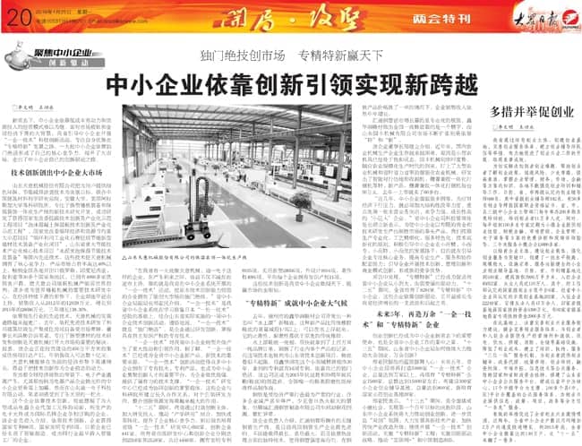 2015年1月25日的大众日报?两会特刊《独门绝技创市场 专精特新赢天下――中小企业依靠创新引领实现新跨越》重点介绍了我公司技术创新的经验,敬请关注。